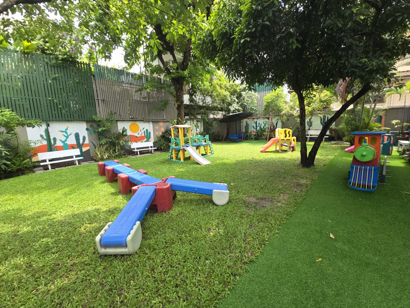 ナーサリー(幼児部)には、緑あふれる遊び場とカラフルな教室があり、自由に遊びながら成長できる環境が整っています